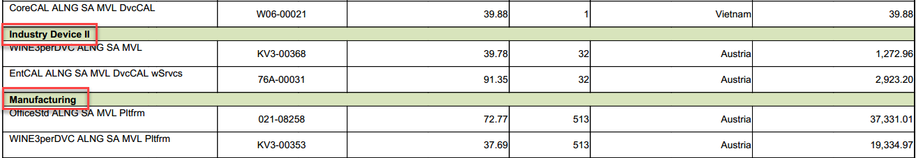 Typically profiles and tenants can be found as a subsection in CPS. Profiles can be found in both “SECTION 1. Licenses and Software Assurance” and “Future Pricing”. Please note that the “Enterprise” subsection should not be treated as a profile and will be automatically added in the Wizard. Please inspect the below screenshot from a sample CPS with “Industry Device II” and “Manufacturing” profiles.