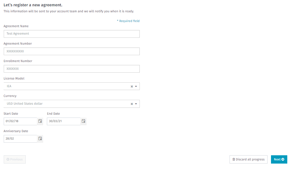 If you do not find your EA Agreement in the list, click on the Register New Agreement tile to create a new agreement. Your SoftwareOne Account Manager will receive a notification and will need to set up the agreement in our backend system in order to get the process completed. Refer to the Register New Agreement section for more information.