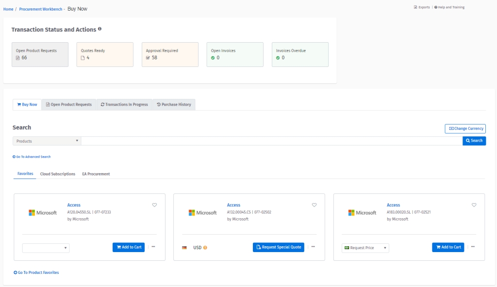 On the Procurement Workbench page, you will find different sections that enable you to purchase products, view your transactions, and check your purchase history.