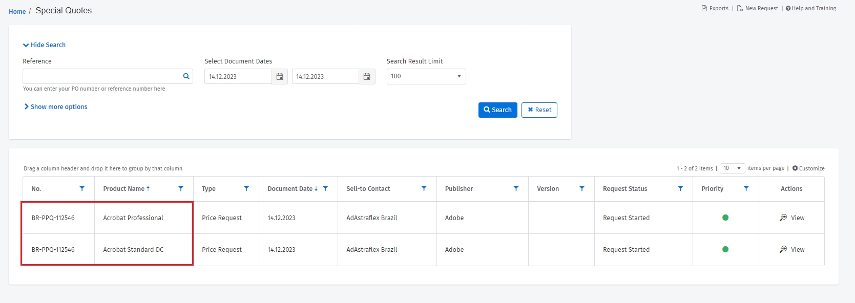 Note that if your special quote contains multiple products, each product request is displayed in a separate row on the Special Quotes page. For example, if your special quote is for Acrobat Professional and Acrobat Standard, both products are displayed separately on the Special Quotes page, even though they are a part of the same request.