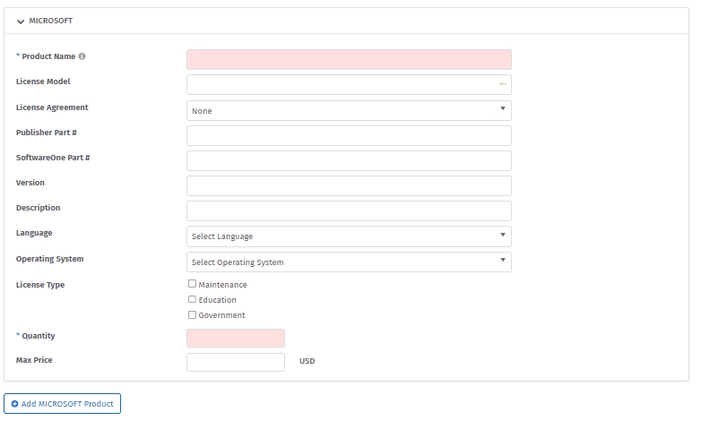 Under Location, choose the SoftwareOne entity that you are ordering from, the country where the product will be used, and your company's address.