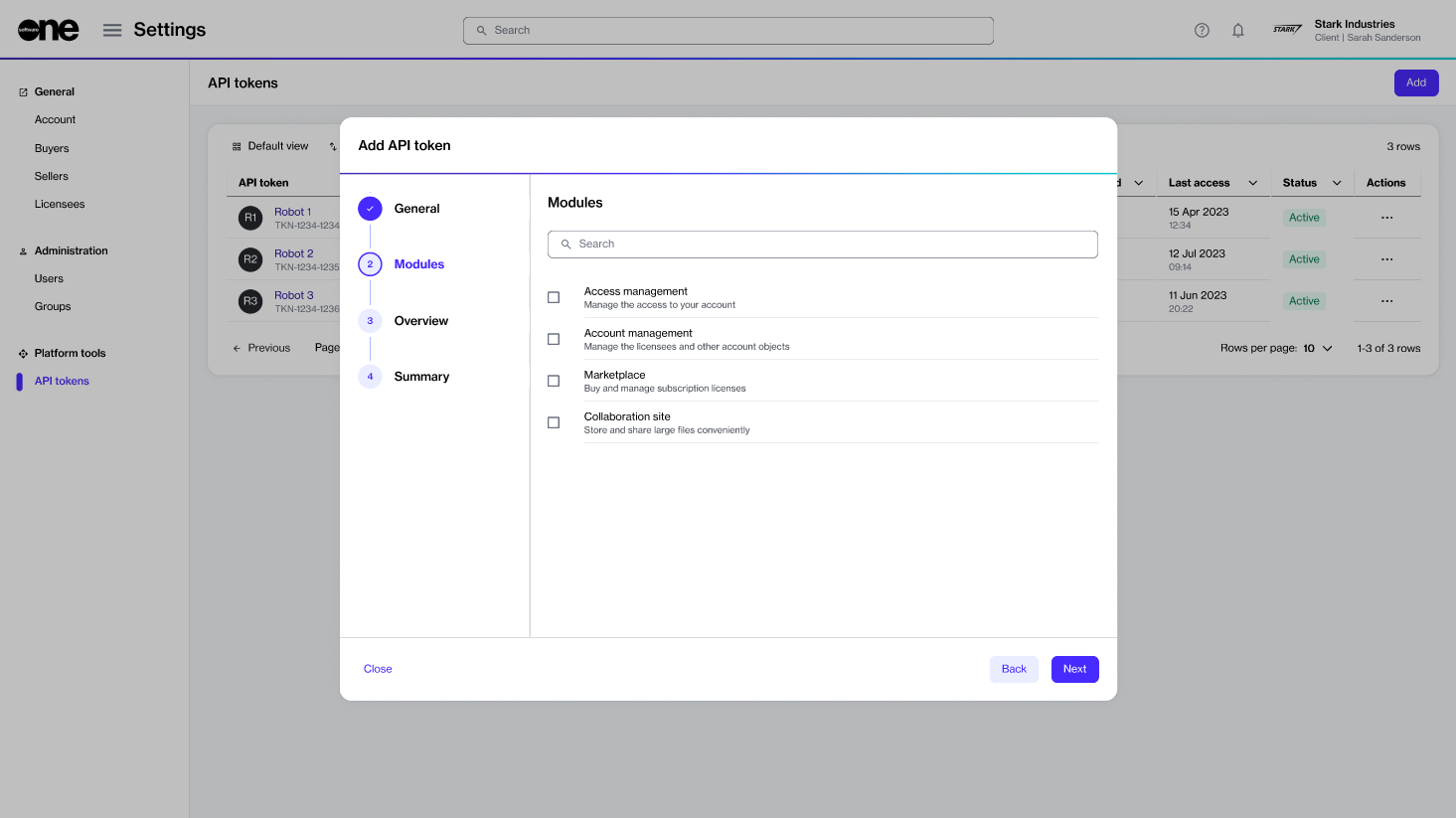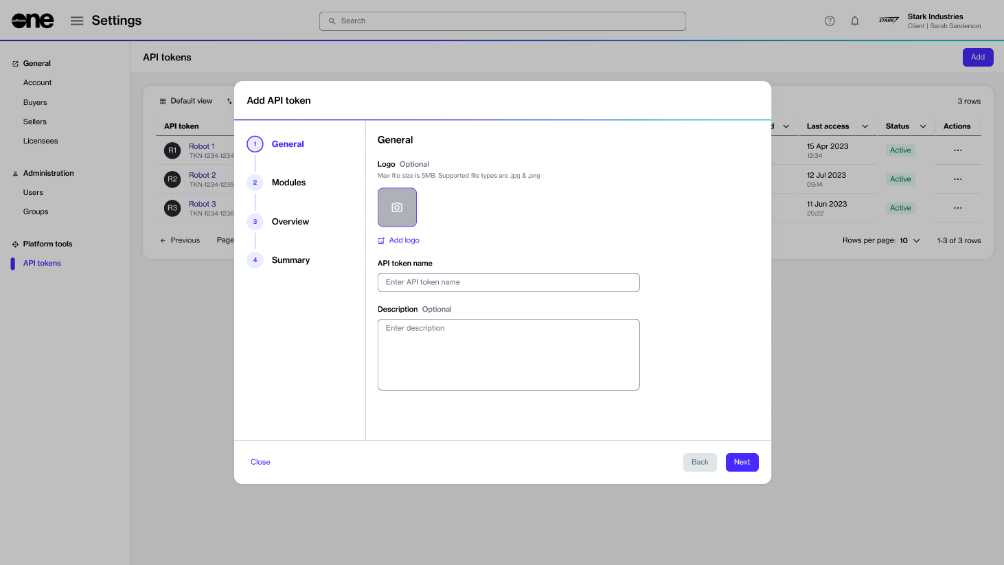 Create API tokens to access the platform programmatically.