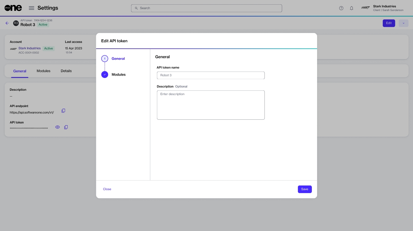 You can update an API token’s description and change the access scope through the Edit option on the token's details page.
