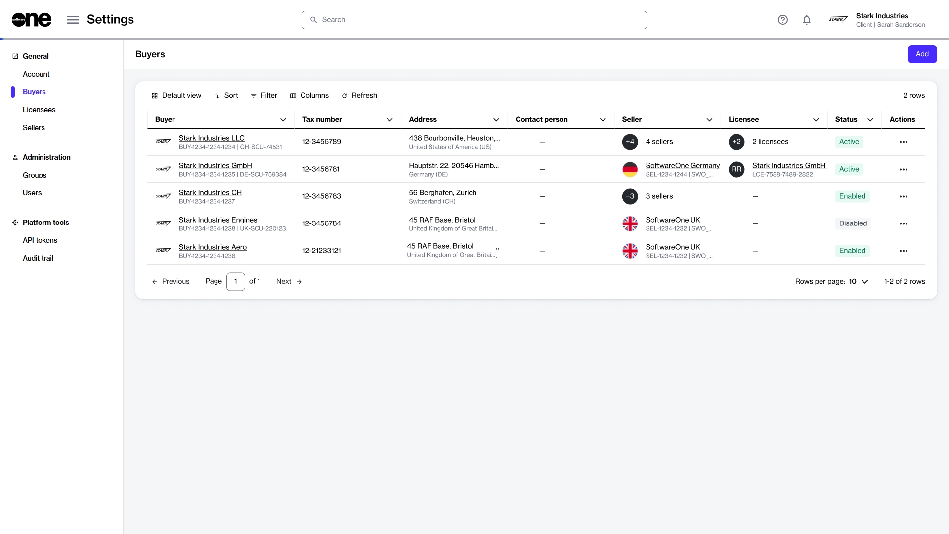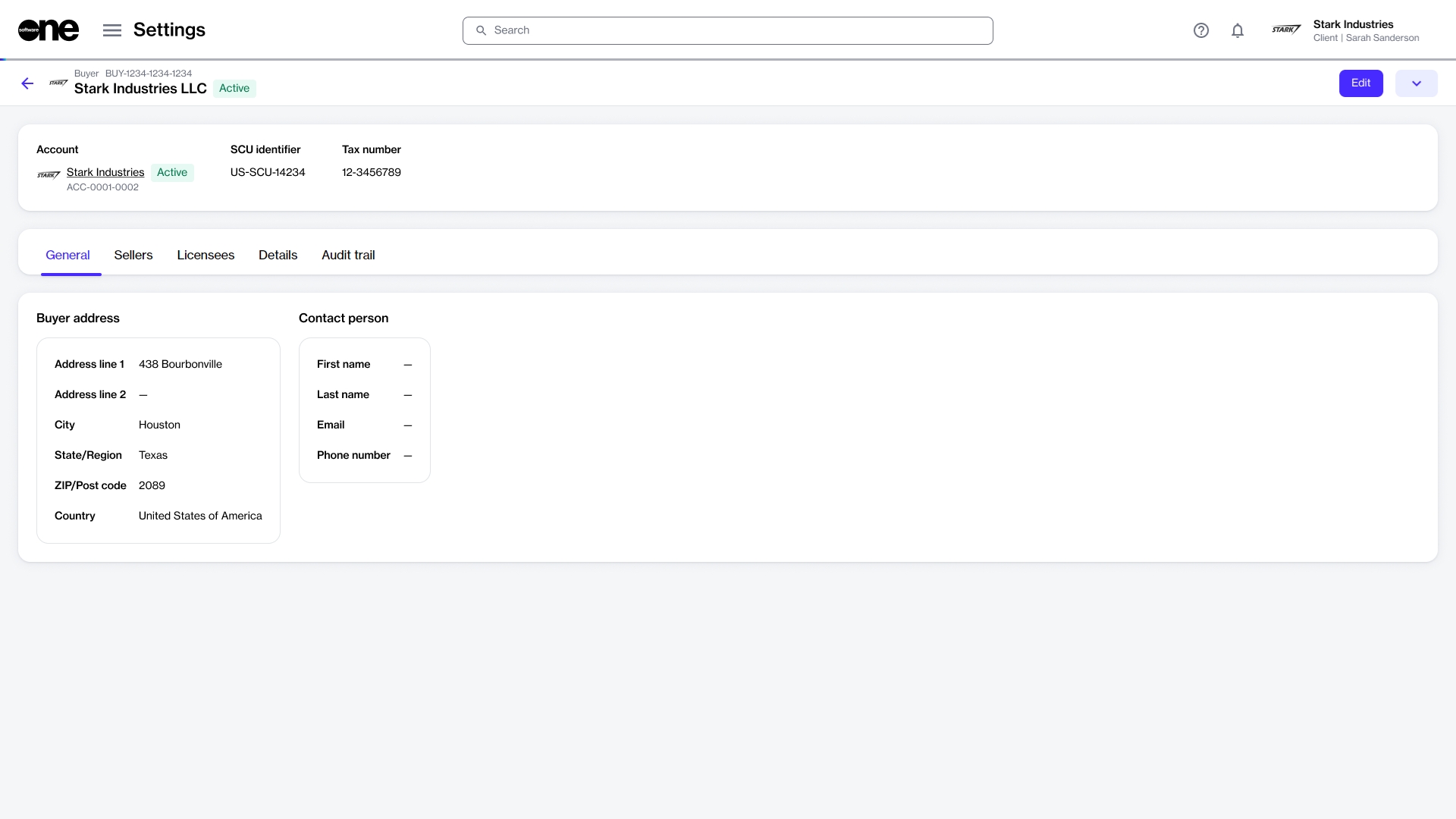Displays the SoftwareOne entity associated with the buyer. There's a 1:1 relationship between a buyer and seller, meaning each buyer is linked to one or more sellers.