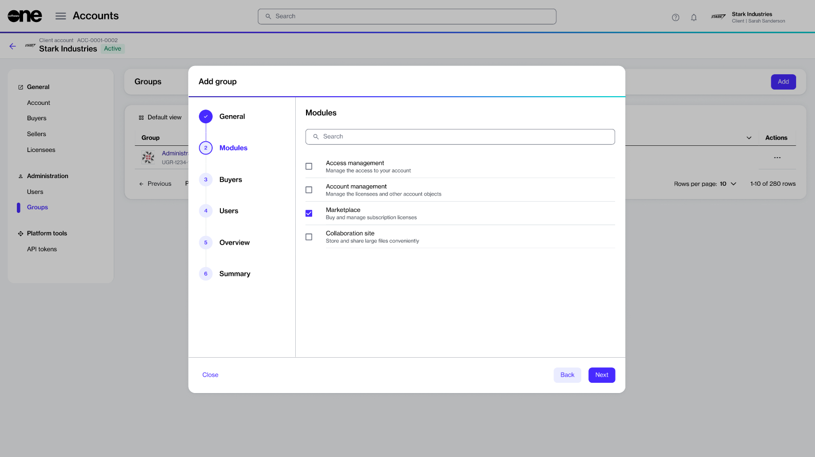 If Group 1 has access to the Marketplace module, and its members are restricted to Buyers A and B, the group members can view the Marketplace objects (like agreements, subscriptions, and more) linked to Buyers A and B.