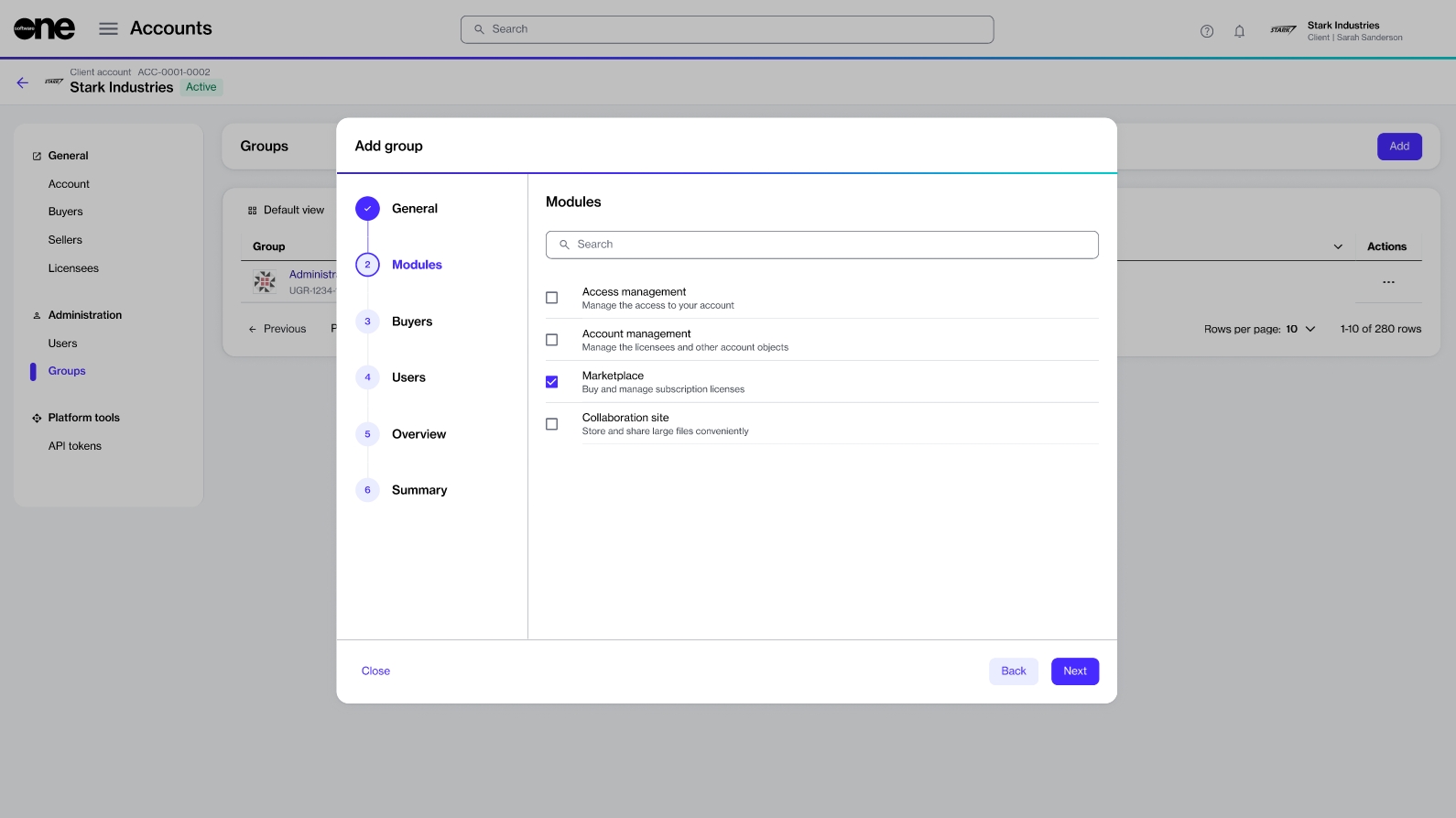- When a group member belongs to multiple groups, and each group has access to several buyers, the member's access is determined by the sum of all those buyers. For instance, if your account contains three groups (Group 1, Group 2, and Group 3) and five buyers (A, B, C, D, & E), the platform will apply restrictions as follows: - If Group 1 has access to the Marketplace module, and its members are restricted to Buyers A and B, the group members can view the Marketplace objects (like agreements, subscriptions, and more) linked to Buyers A and B.