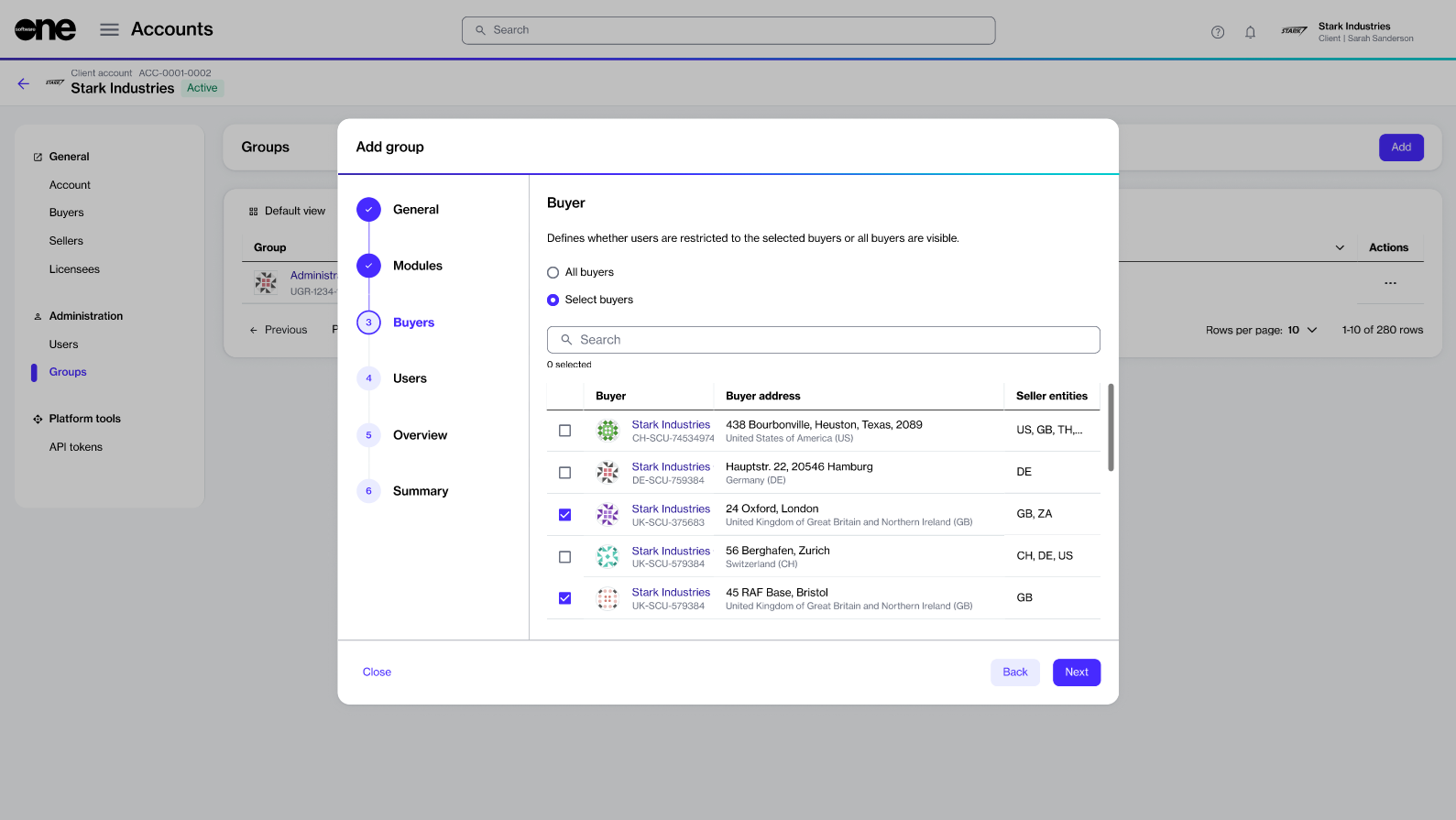 Account administrators can define whether users in a group can view all buyers in the account or only certain buyers. You can customize buyer access when creating or updating a group.