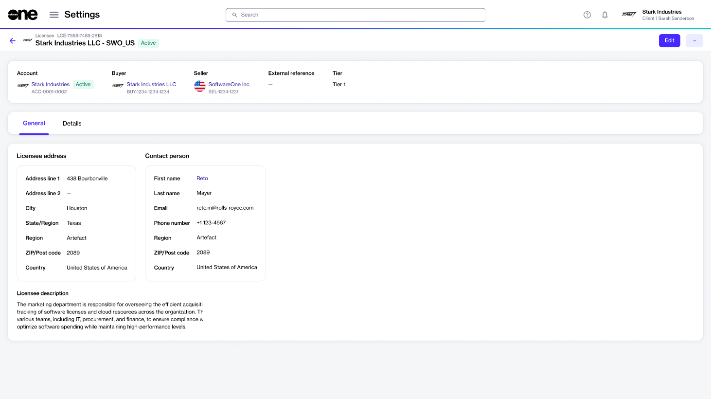 Account administrators can update the general information for a licensee, such as name, description, or address, from the licensee details page. You can’t change the buyer or seller entities linked to a licensee.