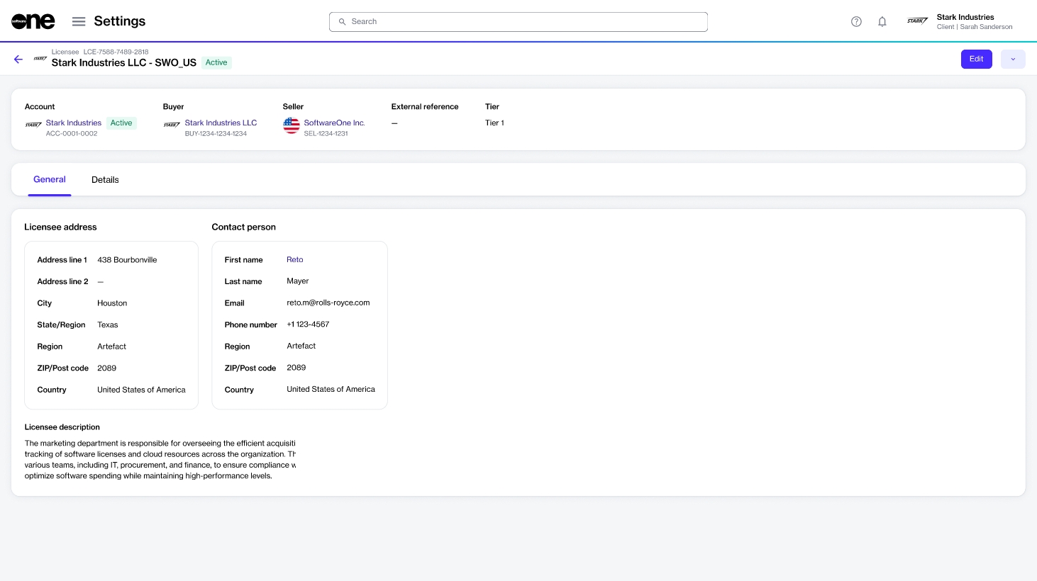 If you need to change general information such as the licensee's name, description, or address, you can do so from the licensee details page.